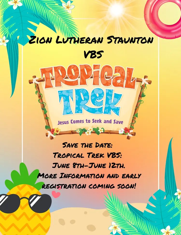 Get ready for Tropical Trek VBS! Join us June 8-12 for a week of fun, learning, and adventure. More details and early registration coming soon!We are thrilled to announce the upcoming Tropical Trek Vacation Bible School (VBS) adventure! Mark your calendars for an exciting journey filled with fun, le
