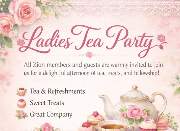 All Zion members and guests are warmly invited to join Zion for the Ladies Tea Party on Sunday, April 26th, 2026. This free event begins at 1pm at the School Gym. Bring your favorite party hat and join us for a delightful afternoon of tea, treats, and fellowship! Guest Speaker: Peggy Kuethe – Space